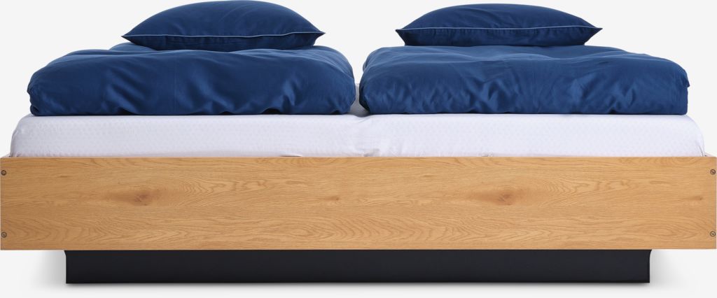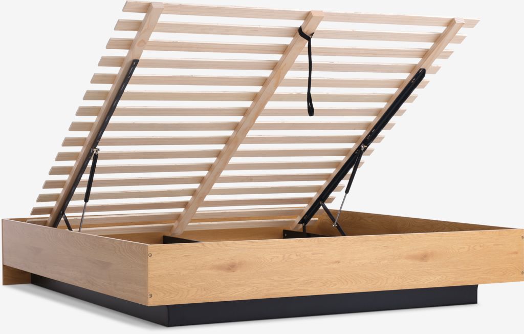 Vi samler disse møbler fra JYSK: Sengeramme ELLINGE 180×200 m/opbevaringsplads egefarve.
